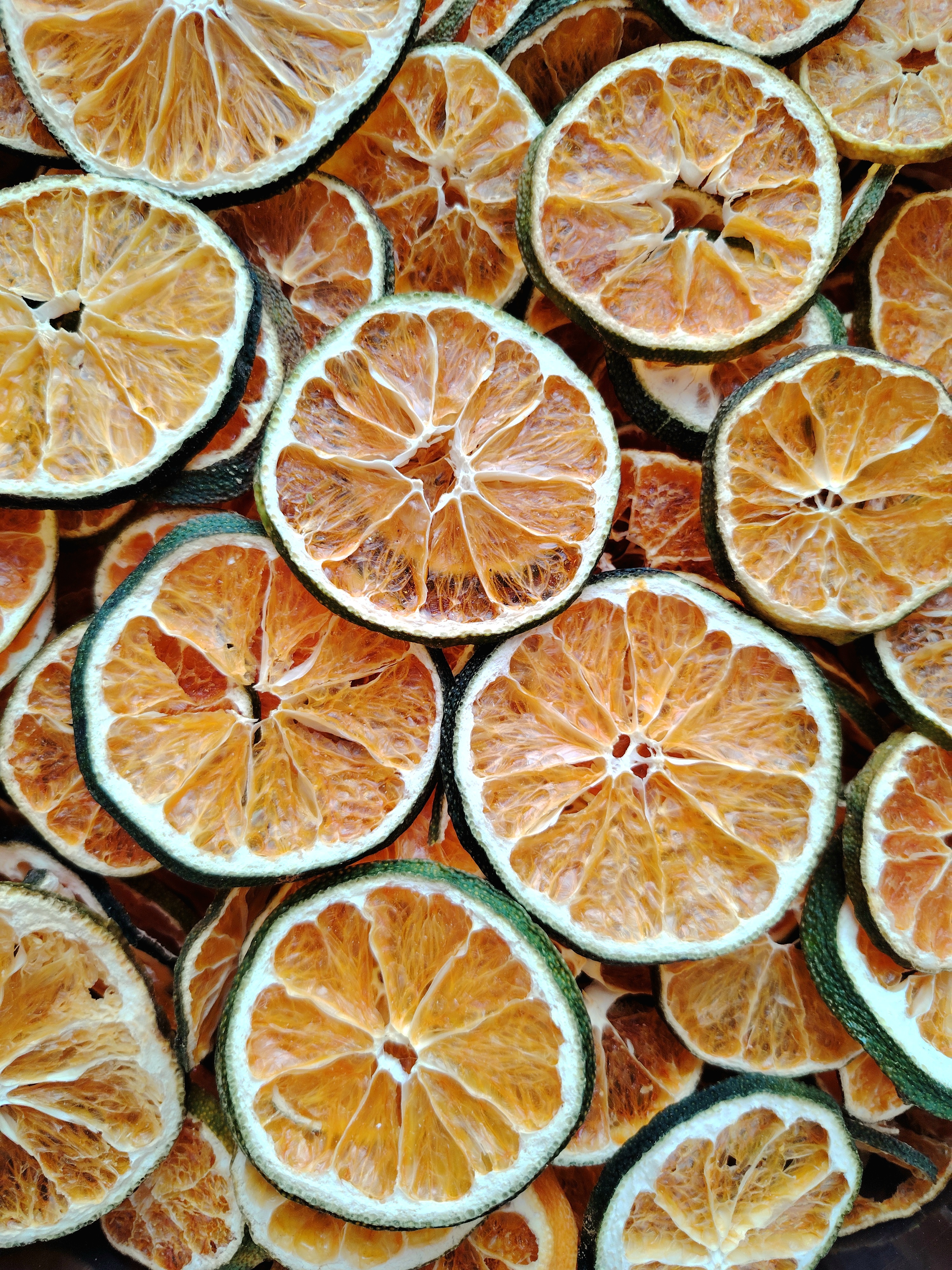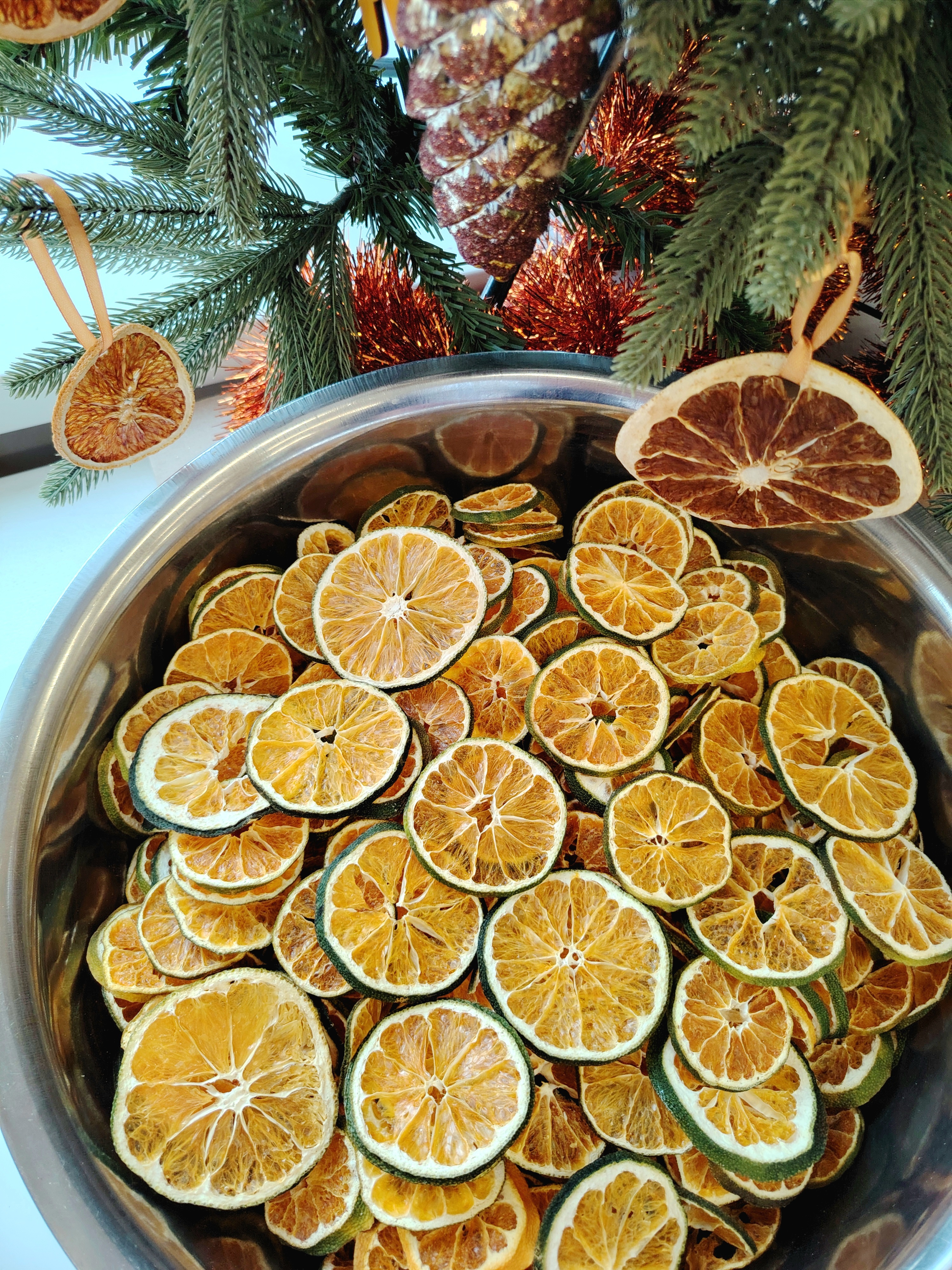 Цитрусы отбираются вручную, вкладываются только серединные цельные дольки. Изначально свежий мандарин очень тонко нарезается, затем высушивается при низкой температуре. Только при такой технологии его цвет остается насыщенным и он идеально подходит для декора.