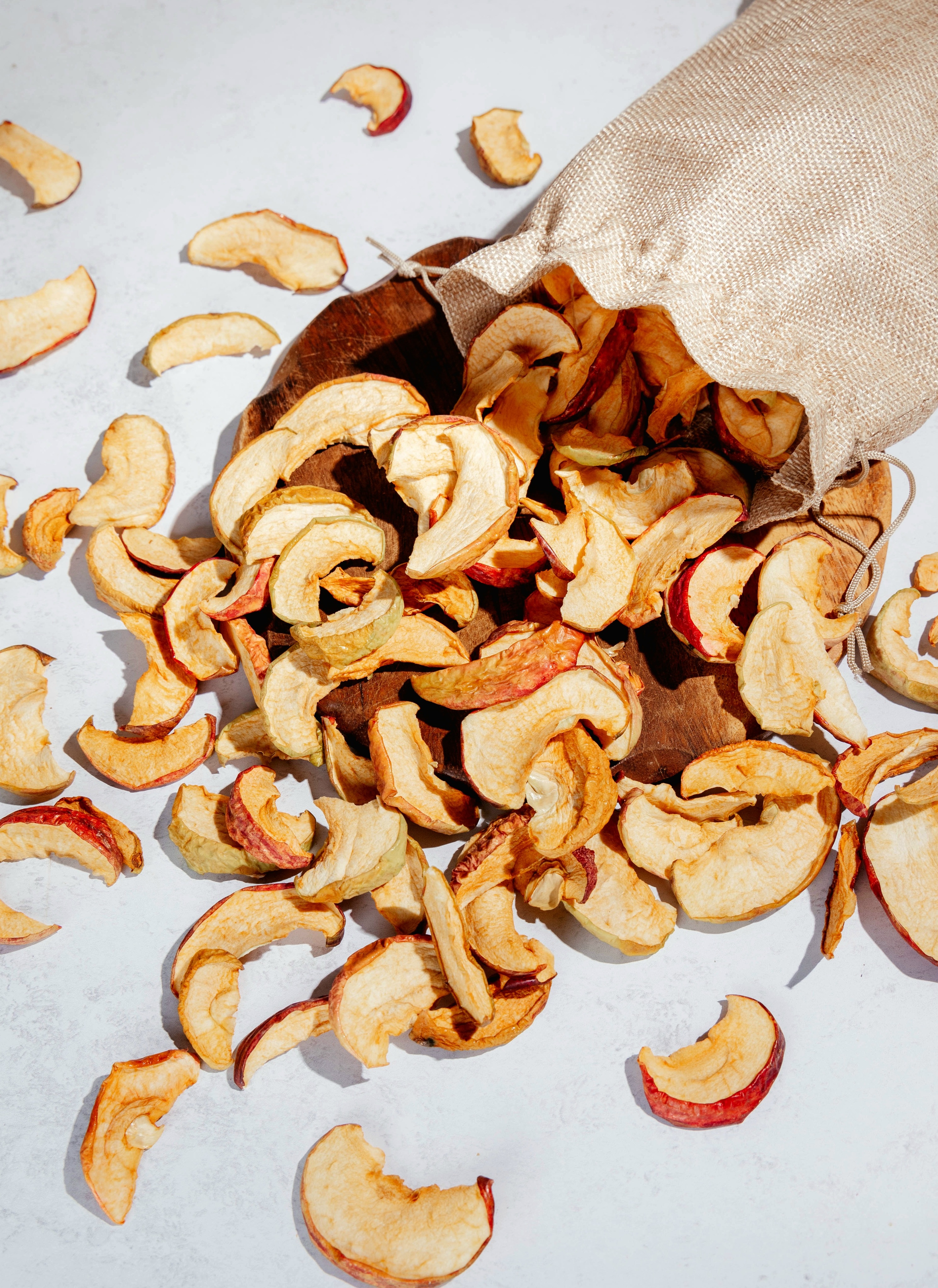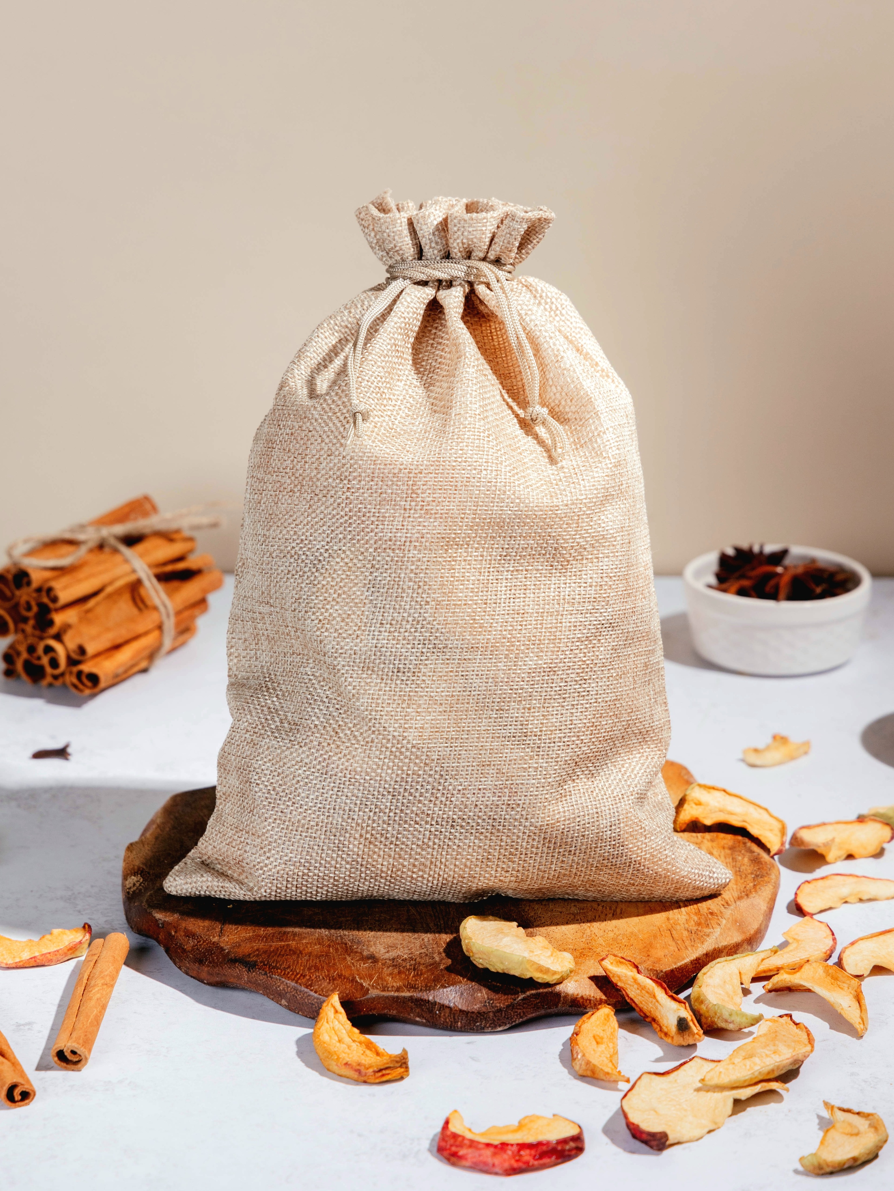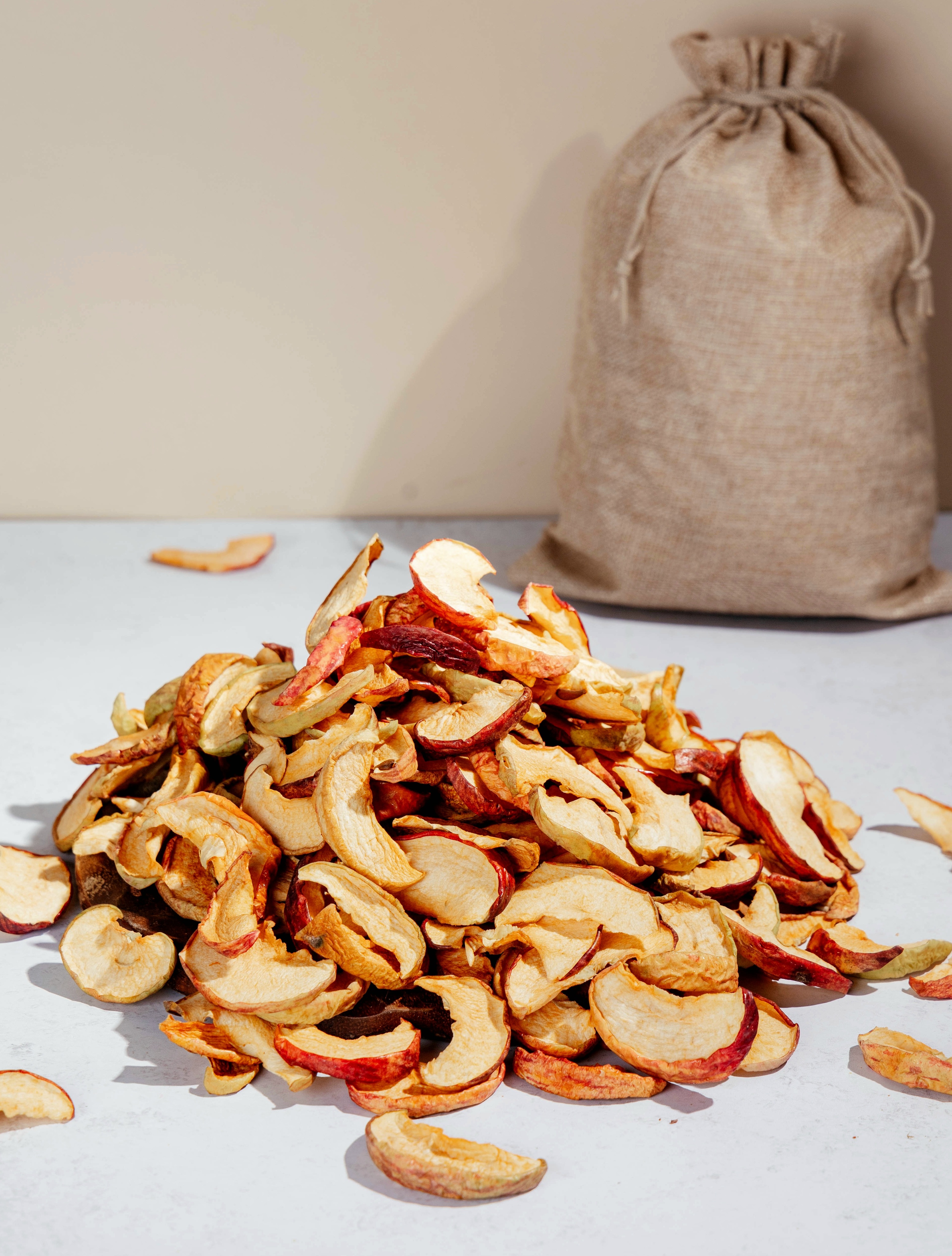 Наши орловские яблочки в холщовом мешочке. В составе только натуральное сезонное яблоко дольками, с кожурой. Сырьё высушено на нашем производстве. Не обработано консервантом, без вымачивания в сиропе. Просто яблоко. Готово к употреблению.