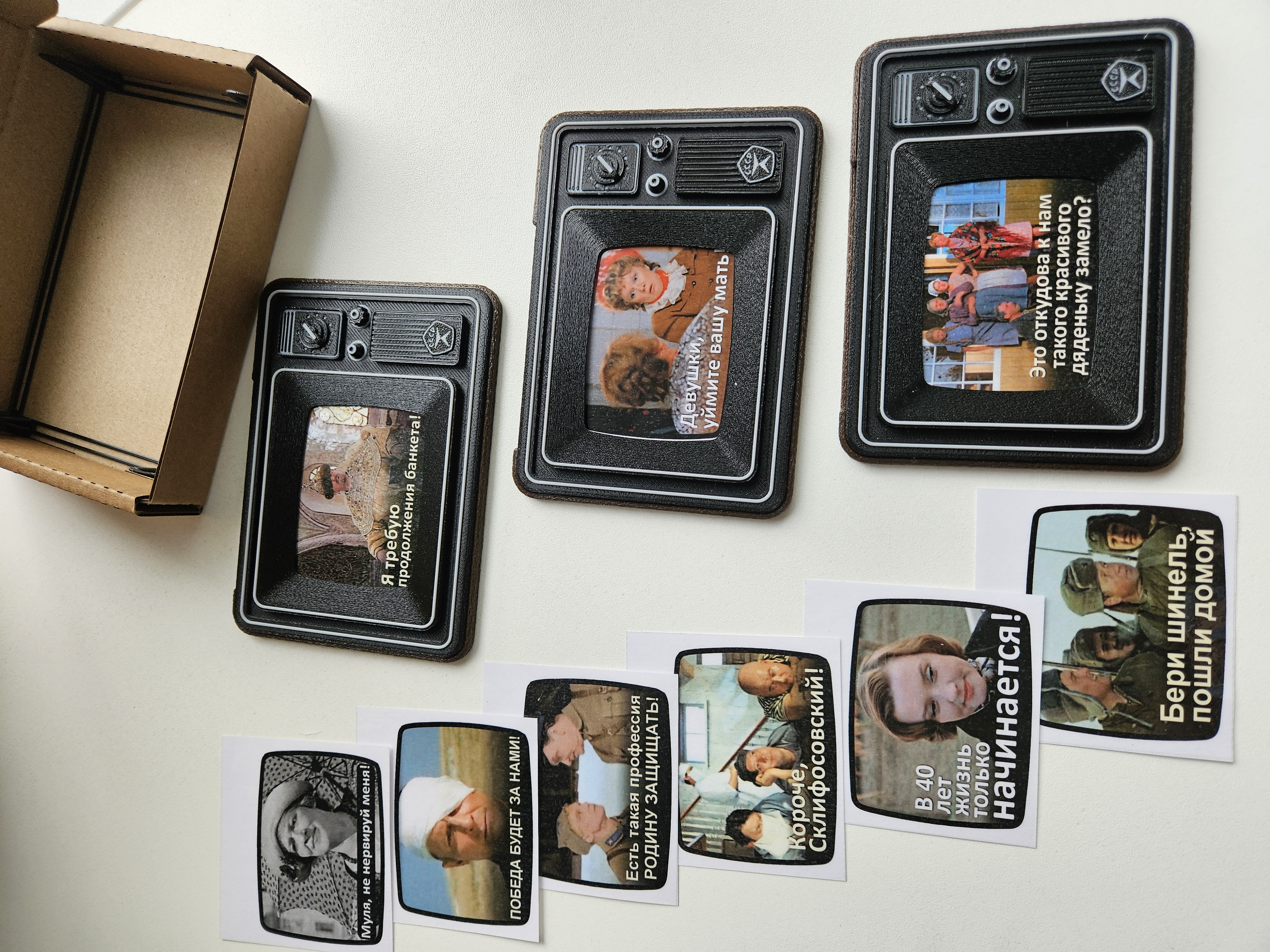 В набор входят три магнита в форме телевизора и девять вариантов слайдов с культовыми фразами из любимых советских фильмов. Оформление в стиле ретро ТВ придаёт магнитам особый шарм и ностальгическую атмосферу. Вы можете легко менять карточки в зависимости от настроения.