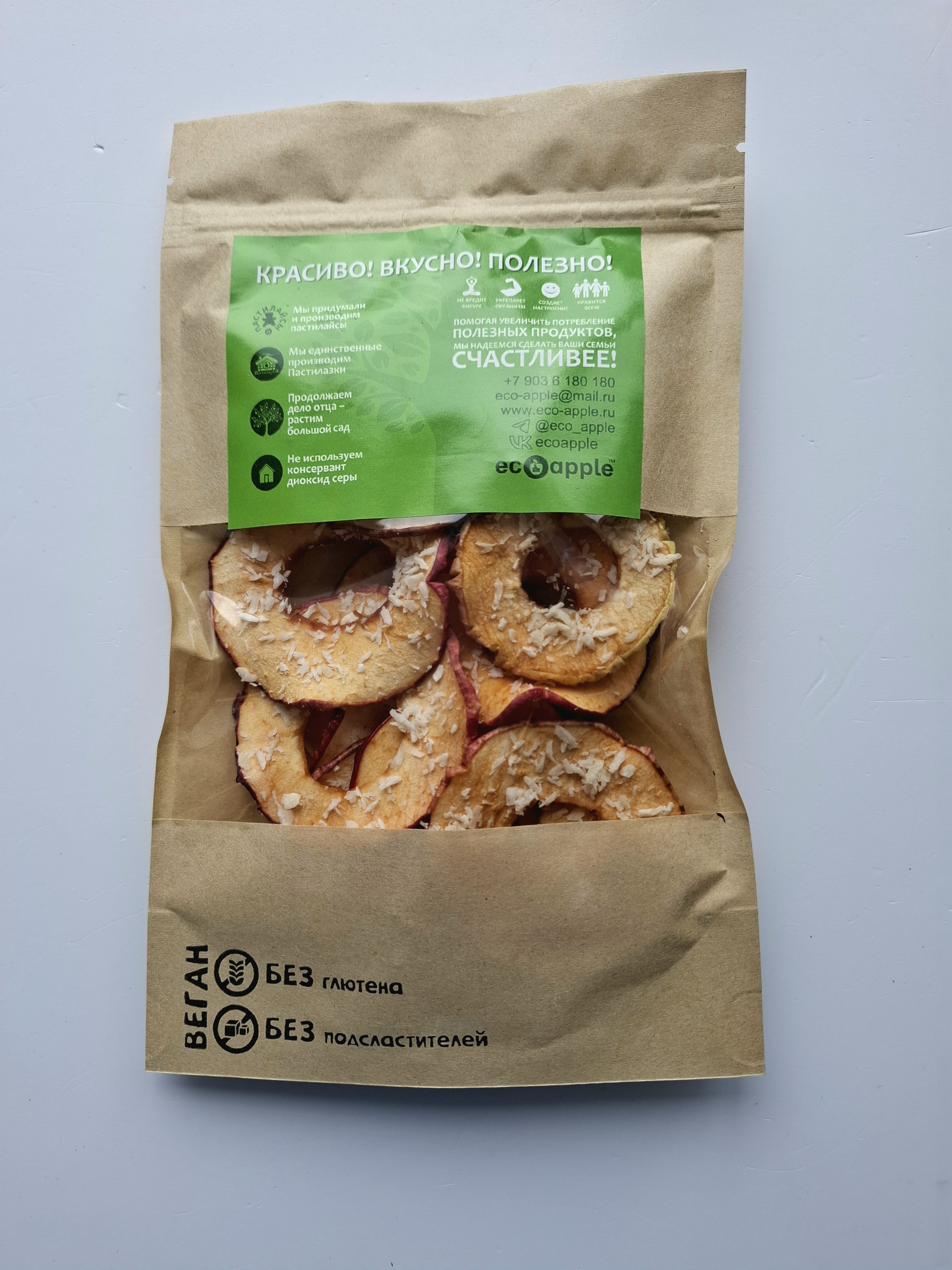 Яблочные слайсы смазаны медом, посыпаны ароматной органической кокосовой стружкой и высушены. В этом лакомстве сохранены все полезные свойства свежих яблок, богаты клетчаткой, витаминами и антиоксидантами. Мед добавляет природную сладость и обладает антисептическими свойствами, а кокосовая стружка, в свою очередь, является источником полезных жиров и клетчатки, что делает этот перекус не только вкусным, но и питательным!
